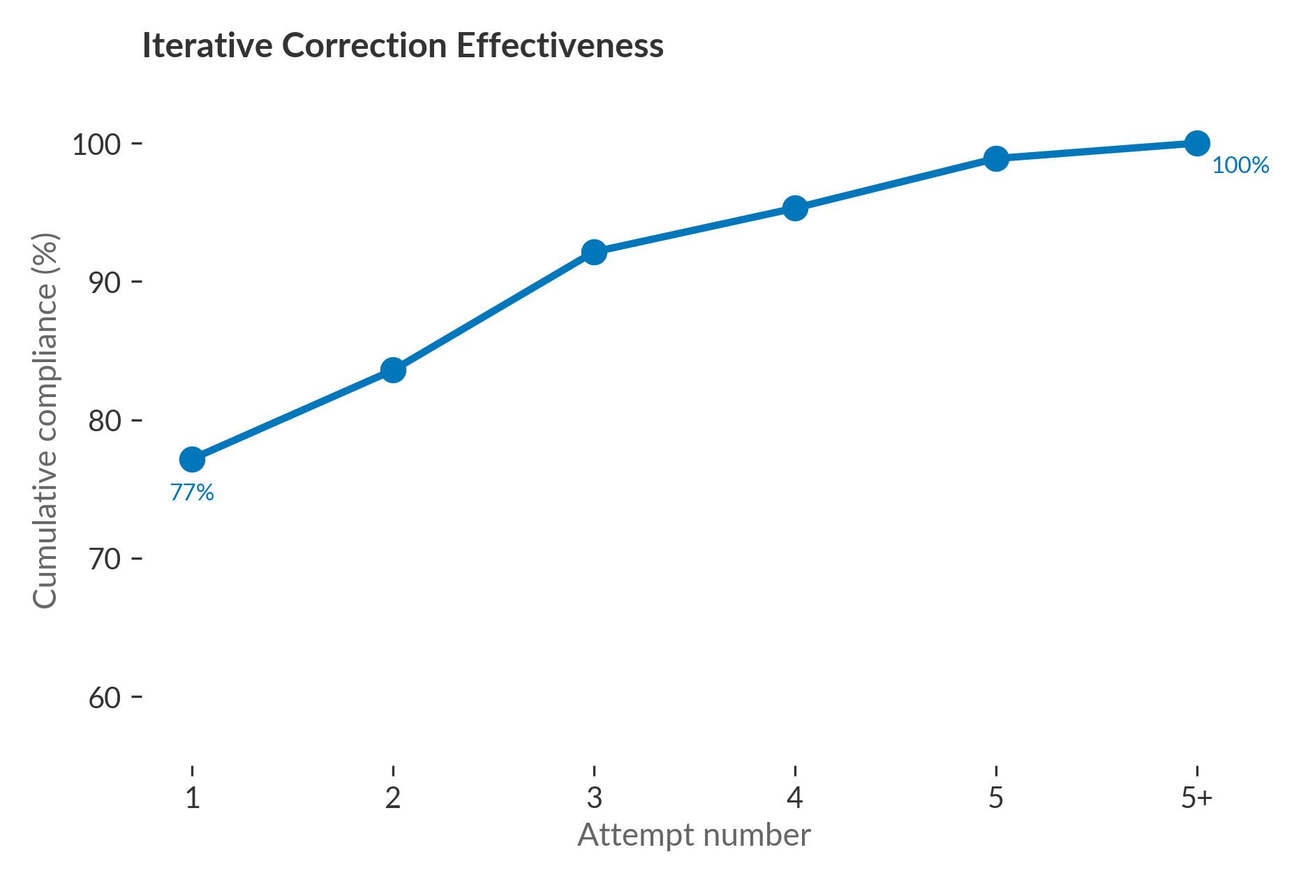 Our system achieved 100% compliance after correction. That sounds like success. But 100% compliance after five attempts is not the same as 100% compliance on the first attempt. The first number means the scaffold works. The second number means the model works. On the test set, the model’s first-attempt compliance was 64.3%. That is the real number.