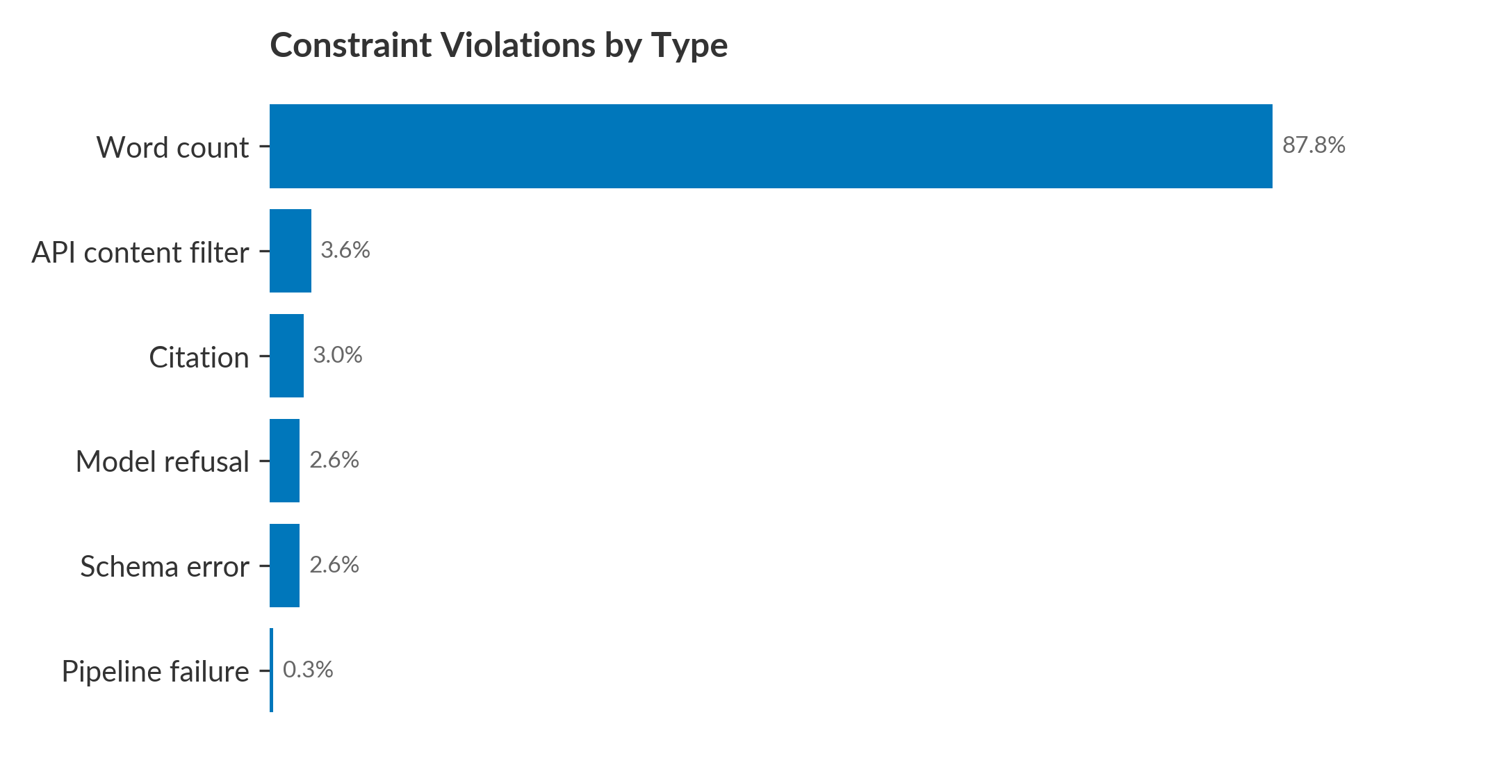 The simplest constraint was the hardest to enforce. On the development set, 85.9% of outputs met all format and length requirements on the first attempt. On the test set, that dropped to 64.3%. Word count violations accounted for 95% of all test errors. Not citation errors. Not format errors. The model couldn’t count to 75.