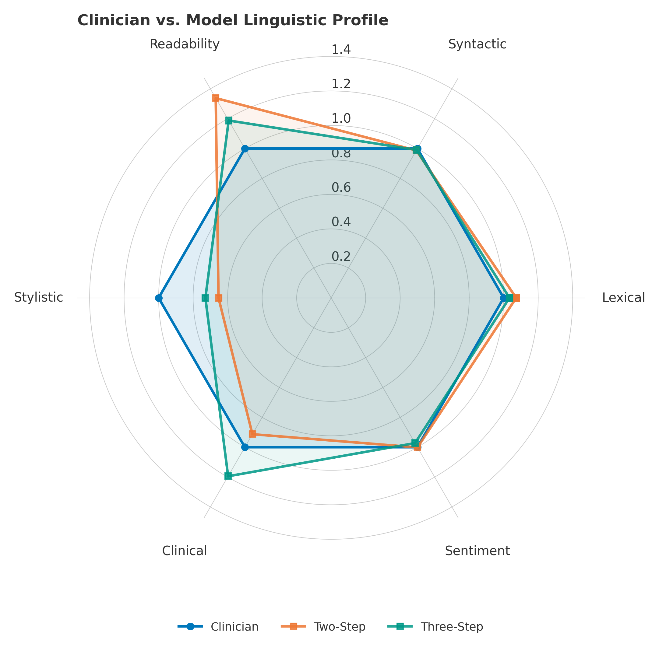 They weren’t. We computed 45 linguistic features across six categories and compared model outputs to clinician references